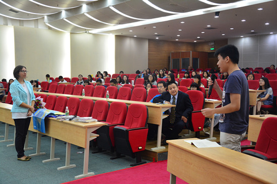 接下来,来自意大利的高莉雅博士为在场学生进行了一次精彩的讲座。讲座中高莉雅博士向我们介绍了外语教学在几百年来的进步过程:从解析语法、注重口语和理解,到重视沟通能力,向大家展现了外语教学的发展历程,体现了博士在教书过程中的心得体会。高莉雅博士还介绍了其中两本赠送书籍的内容,书籍图文并茂,十分吸引在场学生。