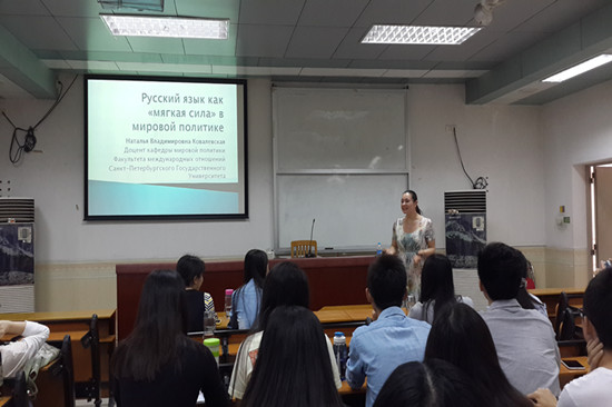 俄语中心,为我校50多名俄语系大四学生做了一场以“语言与国家软实力”为主题的讲座。出席讲座的还有俄语中心主任杨可教授、俄语系郭利老师。