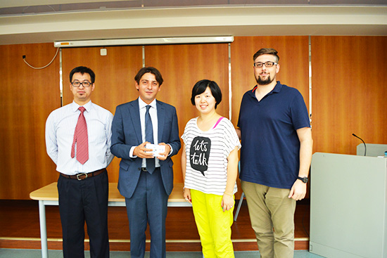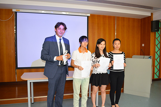 本网讯 10月21日下午,第十五届意大利语言文化周系列活动之专业讲座暨斯特雷佳文学奖入围作品笔译比赛颁奖仪式在我校MBA教育中心306教室隆重举行。出席本次会议的有意大利驻广州总领馆领事白思诺(Massimo Baldassarre)先生,意大利驻广州总领馆文化处负责人施丽萍女士,外教Matteo Brandi老师以及欧美a片