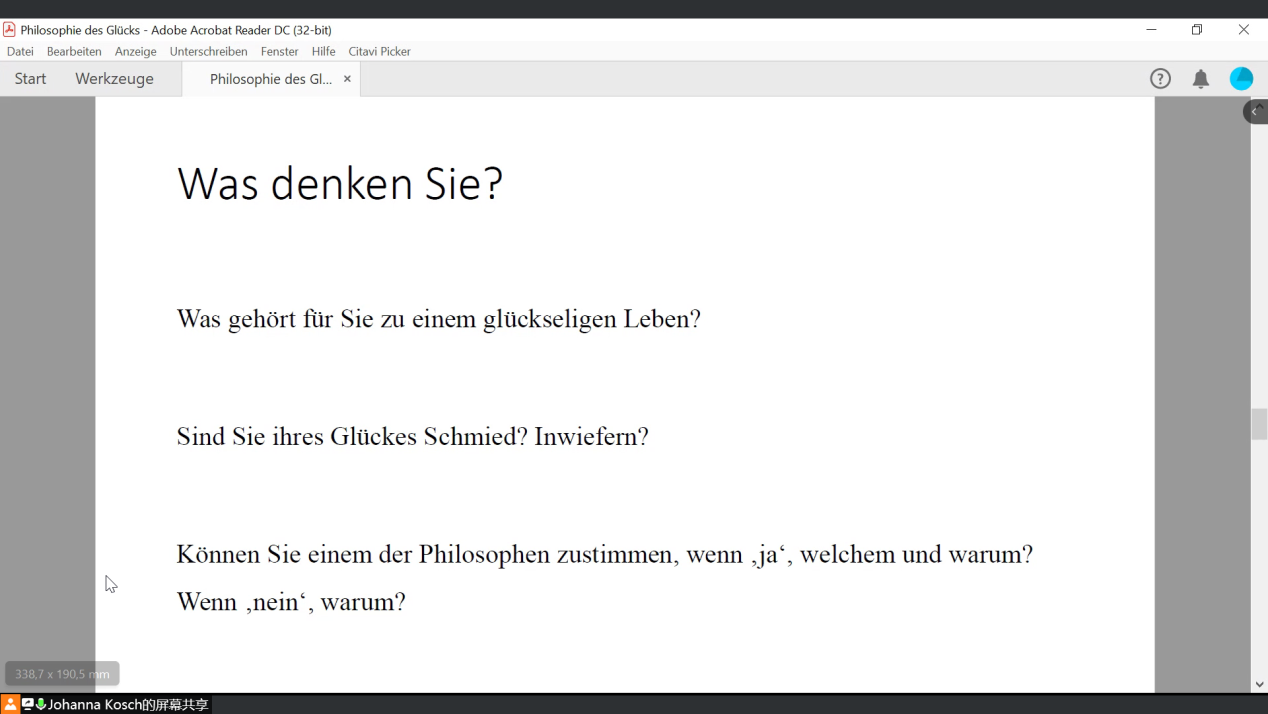紧接着Johanna Kosch女士引导学生就“你如何定义幸福的生活?如何对自己的幸福负责?你是否同意上述某位哲学家的观点,请给出你的看法。”这三个问题展开讨论。在分组讨论结束后,德语系师生在问答环节中分享了自己的看法或提出疑问,Johanna Kosch女士对此一一解答。本次讲座取得了良好的效果,同学们纷纷表达对接下来的系列讲座充满期待。广外德语系哲学专题系列讲座第二、第三讲将分别于今年5月和6月举行,主题依次是:Heimat(故乡)和Arbeit(工作)。