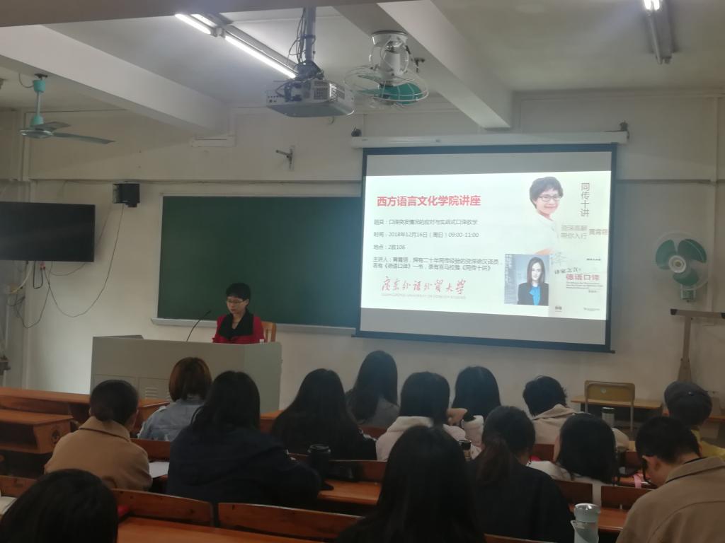 带来了一场关于口译突发情况应对及危机管理的讲座。黄霄翎女士从业20余年,是中国首位获得德国外交部德汉同传资格证的中国译员;著有口译专著《译家之言——德语口译》和《同传十讲:资深高翻黄霄翎带你入行》。讲座由德语系系主任卢铭君教授主持,欧美a片