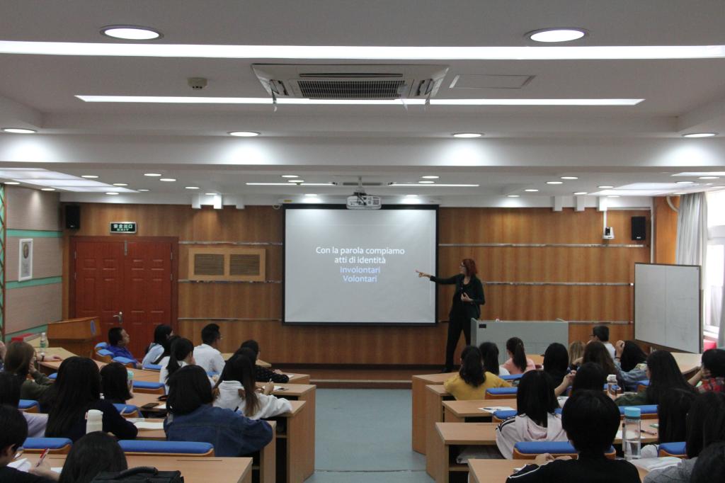 Ghneno女士首先介绍了语言对人类的影响,包括世界观、头脑思考、自我表达、与人交际等等。然后,Ghneno女士为我们详细讲述了但丁时期前后的意大利语,还讲了书面语与口头语的不同之处。最后,我们回归到本次讲座的主题,女士讲到在现今网络环境的影响下,意大利语在本国及在海外的现状。女士认为,在这种环境下,我们应该自动承担起语言文化传播的责任,多一分思考,少一分偏见。
