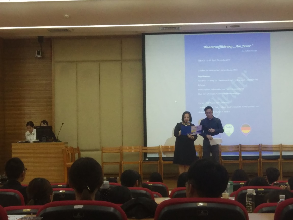 在活动正式开始前,德语1802班的同学们为我们带来了歌曲《让我留在你身边》,用优美动听的歌声为活动拉开了帷幕。在此之后,西方语言学院院长杨可教授为本次活动致辞,对前来参与本次活动的各位领导来宾以及老师同学们表示了诚挚的欢迎。德语系系主任卢铭君教授则为我们介绍了本次戏剧《在火旁》(Am Feuer)的作者Lukas Holliger并朗读了作者为本次活动特意撰写的致辞,使得观众对剧本的内容与主旨有了进一步的了解。