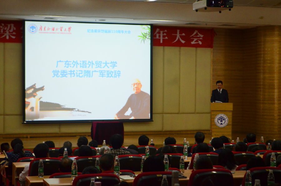 第二个场次的纪念大会在校党委书记隋广军的致辞下缓缓拉开了序幕。之后是由中国外文局副局长,中国翻译协会副会长兼副秘书长黄友义致辞,他向观众们介绍了梁老在中国西方文化教育和跨文化人才培养方面做出的伟大贡献。最煽情的一幕便是梁老长女梁思薇的致辞,与父亲相隔两岸的无奈滴在梁女士的眼中和心里,这段致辞伴随着梁女士对青少年的深情寄望而结束。接下来是梁老学生代表卢岚女士的讲话,介绍了七年的留欧生活对于梁老的人生意义以及表达了发自肺腑的对梁老的怀念与感激之情。紧接着的是黄建华老师《梁宗岱》一书的赠书并致辞的过程,介绍了撰写这本著作的源起及经历,同时在现场对自己的著作进行剖析。