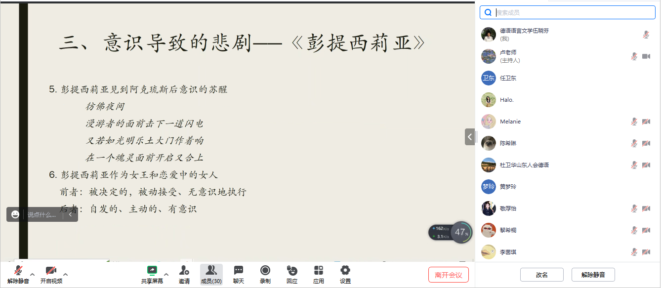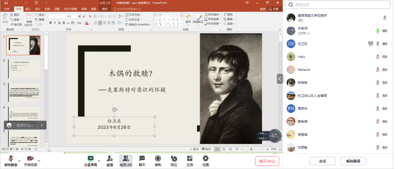 在线上开展了德语系实践周学术讲座,北京外国语大学任卫东教授应邀开展了一场题为《木偶的救赎---克莱斯特对意识的怀疑》的学术讲座。讲座由欧美a片
