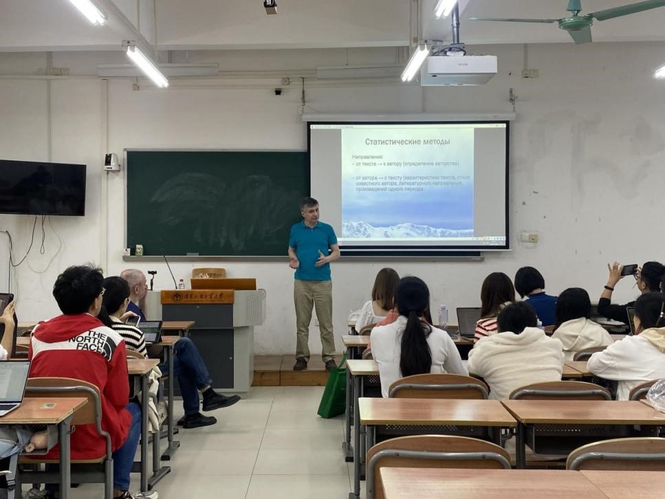 12月8日下午,在语料库方法研究词汇兼容性讲座中,穆欣教授介绍了运用俄罗斯国家语料库对19世纪俄罗斯作家(Л.Н.толстой, Ф.М.Достоевский, И.А. Гончаров, И.С.Тургенев, А.П. Чехов)作品风格进行对比研究的具体步骤。