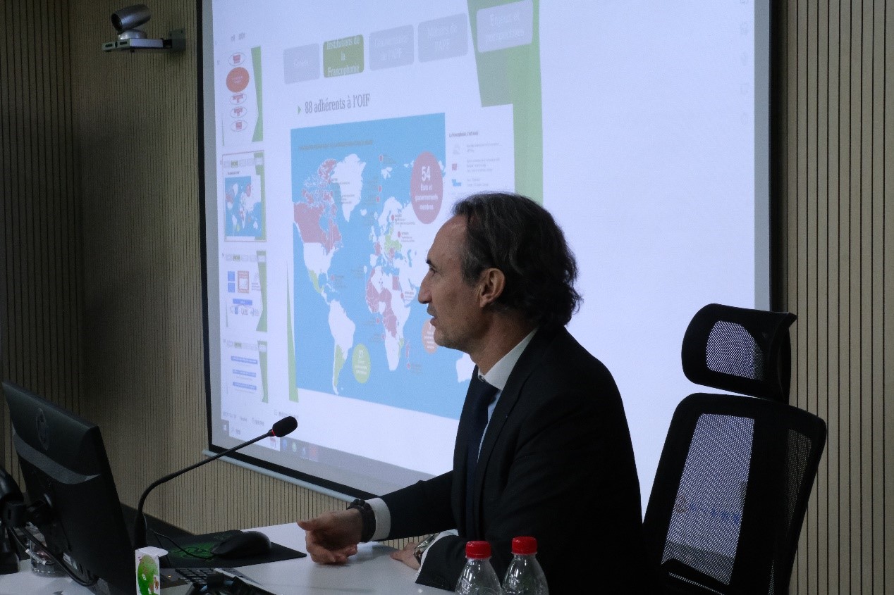 随后,赛斯兰先生为大家详细介绍了“法语地区”的各类组织与体系。法语国家组织包含三类机构:国家政府间的首脑会议、部长级会议以及常设委员会。这一组织还与法语国家议会大会紧密合作,也与四个运营商(opérateur)开展法语多边合作:法语国家本科机构(AUF)、TV5电视台(TV5MONDE)、法语国家市长国际协会(AIMF)和亚历山大桑戈尔大学(Université Senghor d’Alexandrie)。除此之外,它还有两个常设部长级会议:教育部长大会(Confémen)与青年体育部长大会(Conféjes)。
