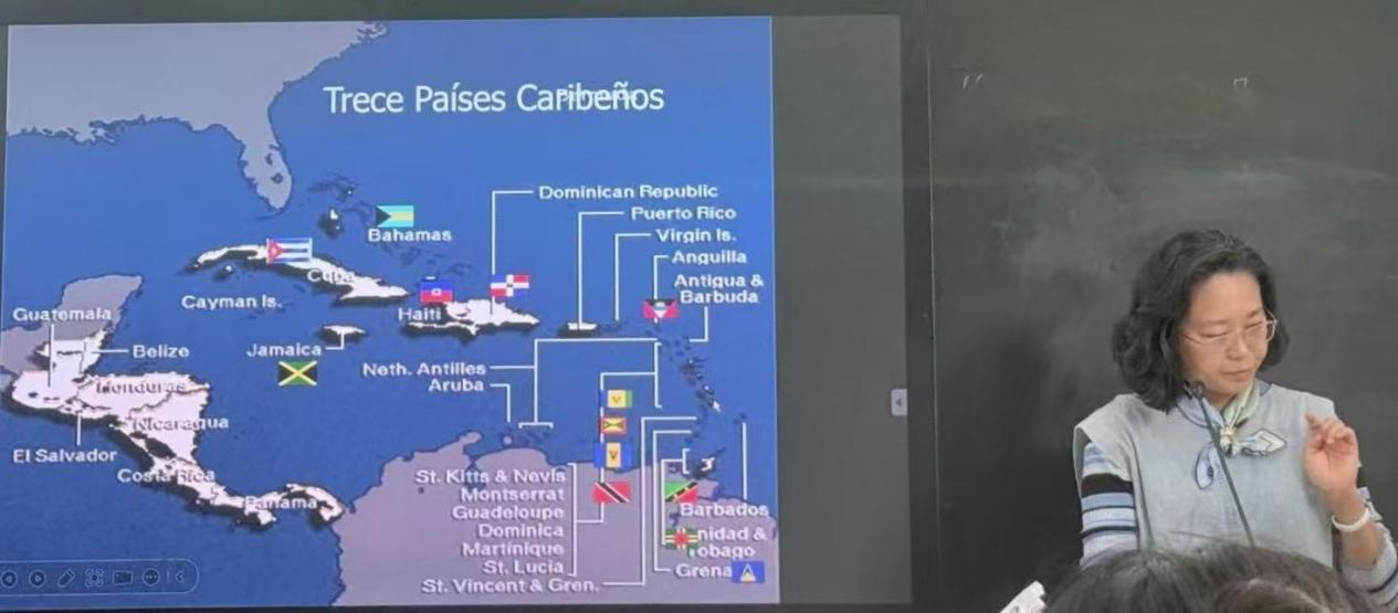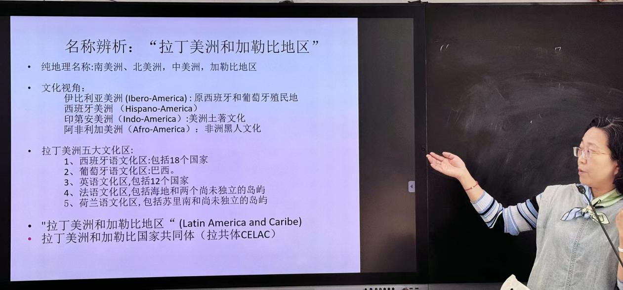 讲座伊始,李紫莹教授通过“拉丁美洲和加勒比地区”概念辨析切入,系统梳理了该地区五大文化板块的分布特征,结合墨西哥三文化广场纪念碑、历史人物和铭文等实例,生动阐释了拉美“混合文化”的鲜明特质——这一由土著文明、欧洲殖民文化与非洲裔文化交汇融合而成的文化形态,正是其统一性与多样性并存的核心体现。她特别指出,拉丁美洲的独立进程具有独特性,土生白人主导的分离运动造就了该地区独特的族群融合现状。