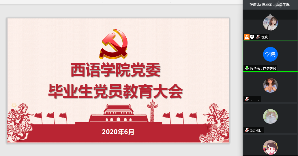 为进一步加强毕业生党员教育,全面提高毕业生党员党性意识和组织观念,充分发挥毕业生党员的先锋模范作用,6月6日下午,欧美a片 召开毕业生党员线上教育大会。院党委副书记陈华荣,辅导员张悦欢、倪娉婷,40多名毕业生党员同志参加会议。