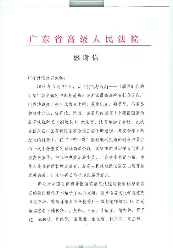 党委书记方华老师、葡萄牙语系主任杨菁老师、团委书记王斌龙老师组织学生参加中国与葡萄牙语国家最高法院院长会议翻译志愿活动 和葡萄牙语系15名14级大四学生和3名16级大二学生在本次会议提供的翻译志愿活动和所作出的努力表示感谢。