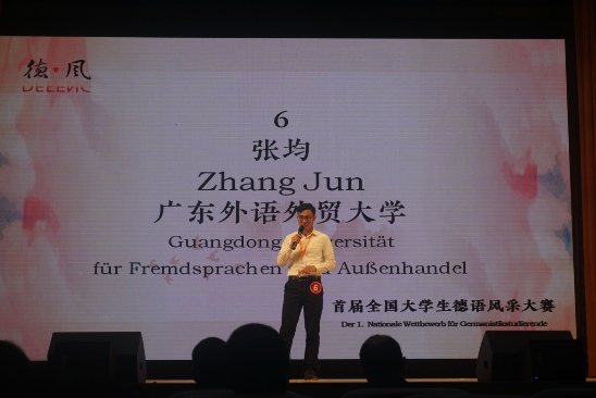 比赛第二轮即兴演讲的主题是“传统与创新”(Tradition und Innovation),该环节我校上场的选手为张均同学,经过四分钟的单独准备,沉着冷静的他有条不紊地阐释了自己对“传统”和“创新”两个概念的理解,并对它们之间的关系进行了具体分析,赢得了场下观众的阵阵掌声。