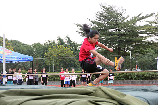 11月17日下午进行的是女子五项全能之二跳远比赛。张莉同学在赛场上用力一跃,在空中划出一道优美的弧线后稳稳地落在沙池中,引来观众的阵阵赞叹。