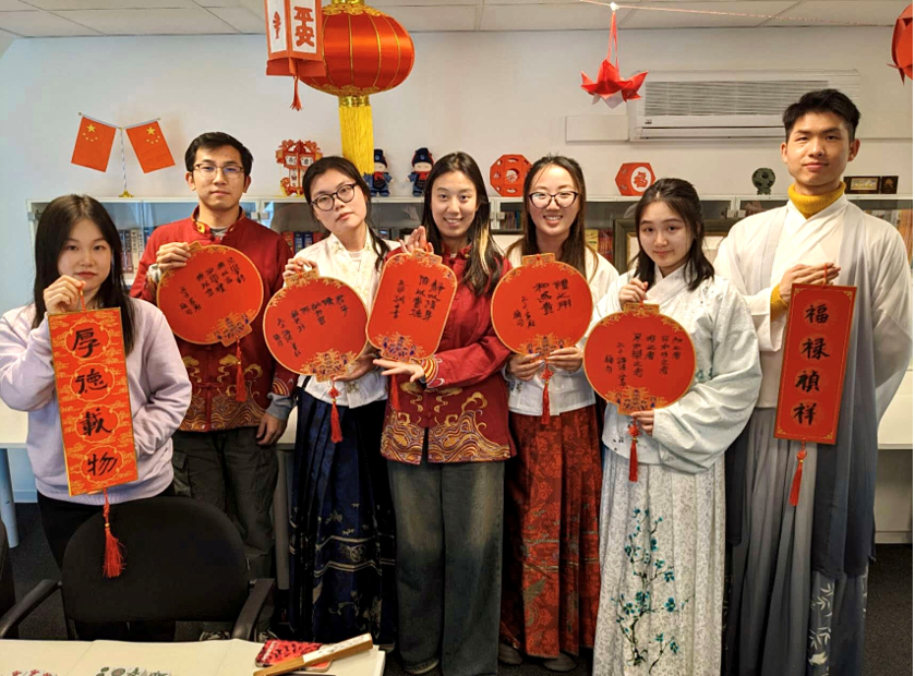 张赫菱(右二)、江林颖(左一)与西安电子科技大学的交换生们一同助力国际汉语日