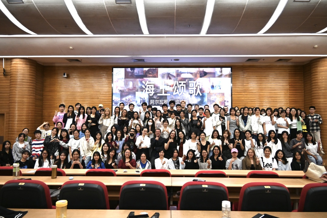 在马努埃尔的朗诵表演中,坎波斯的诗句仿佛与海水融为一体,时而如惊涛拍岸般激烈,时而如深海般静谧。表演者不仅以诗人的视角呈现情感,更生动地演绎了诗中的水手与海盗形象。由马努埃尔设置的背景乐音和印象派海洋系列油画背景与朗诵表演相得益彰,多维度全方位地传递诗歌内在复杂的感官表达,让每一位在场师生都获得深度沉浸式的诗歌视听体验。