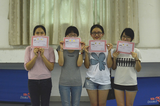 经过激烈的角逐之后,杜杉杉/周海欣组合取得了本次女双比赛的冠军,西语1301李凌飞蝉联了男单比赛的桂冠,祝贺他们!