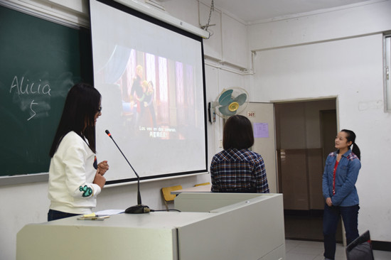 比赛开始前,选手们都在紧张地准备着。第一轮比赛开始,选手们轮流上台朗读课文。他们声音洪亮、发音标准,每个人都显得信心十足。紧接着,第二轮比赛——才艺展示开始了。选手们一个人一组或几个人一组,使出了浑身解数:唱歌、跳舞、诗歌朗诵、电影配音等等。值得一提的是,第一组上台的李欣倩、李薇和蔡佩玲为大家带来的音乐剧,其中穿插了A todo color、Rosas、Siyo fuera un chico、Me gustas tú等歌曲,新颖的形式让大家眼前一亮;熊柳琛同学带来的一段拉丁舞也让大家印象深刻。选手们精彩的表现都赢得了台下热烈的掌声和欢呼声。