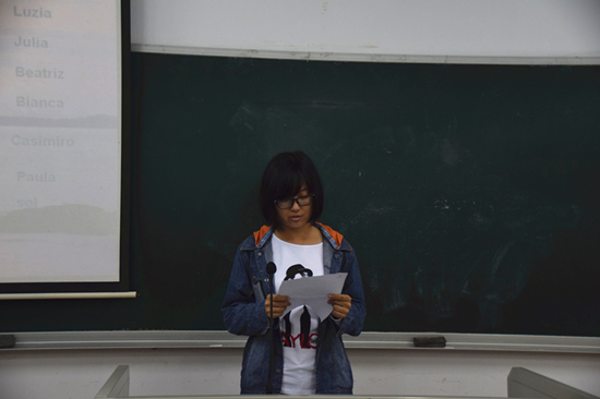 本次比赛共分为两个部分,第一部分为文章朗读。老师赛前准备三篇课外文章,选手现场抽取一篇朗读。每位选手有大约五分钟的准备时间。该环节是对学生语音阶段学习成果的一次直接检测。第二部分是学生的演讲展示,学生可在自我介绍、介绍我的家乡、介绍我的大学生活三个主题中任选一项进行两至三分钟的葡语脱稿演讲。这对于刚学习葡语两个月的大一新生们来说是一个不小的挑战。但是同学们在赛前查阅资料,精心准备,出色地完成了这次演讲,获得了老师们的一致肯定。