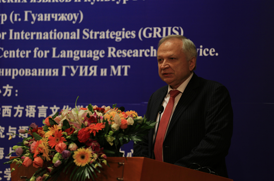 普罗斯维尔金А.Л. 总领事在致辞中回顾了新中国成立后中国俄语教学经历的几个阶段。并特别感谢我校为在华南地区推广俄语和俄罗斯文化所做的大量工作。最后总领事强调,中俄两国政治,经