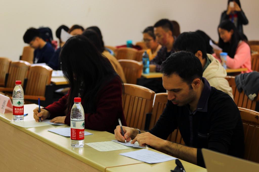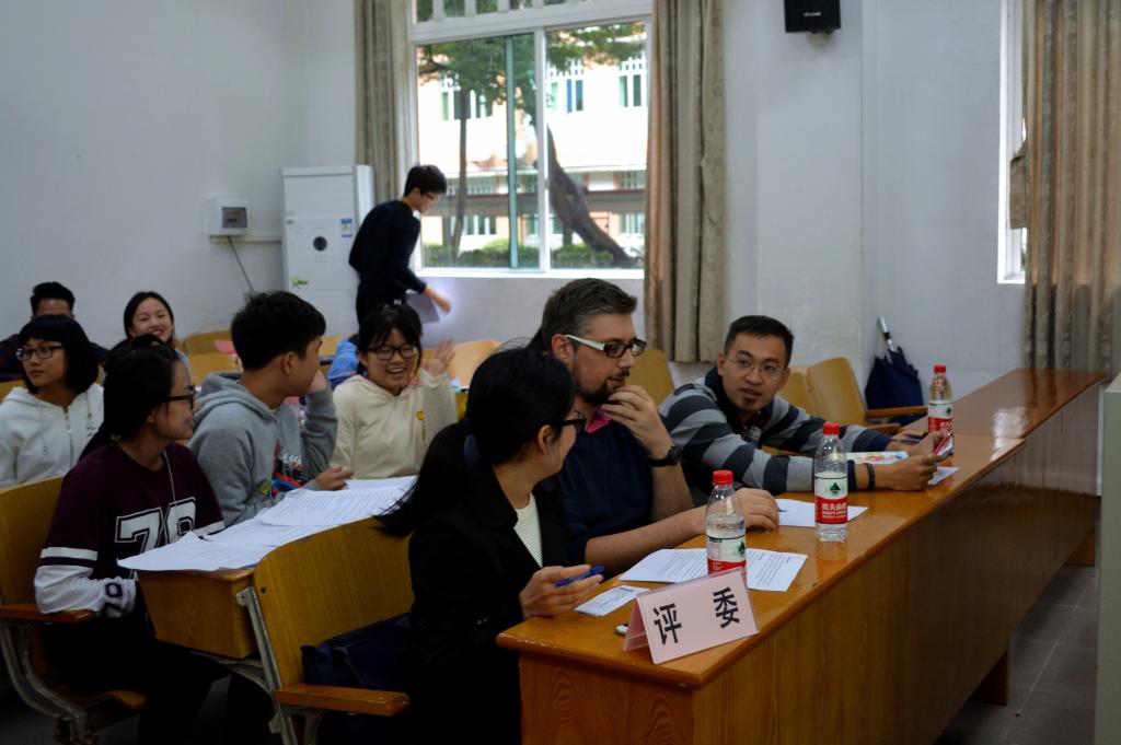 在最后一名同学表演完毕后,工作人员开始了紧张的计分工作。在此期间,法语系刘巍老师和外教Monsieur Rocher对同学们的表现作了点评并对本次大赛进行总结。