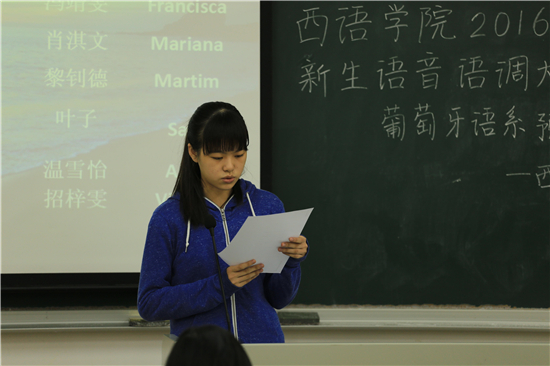 11月10日下午两点半,2016级葡萄牙语系新生语音语调大赛在六教202准时举行。本次大赛由2015级葡萄牙语系Paula同学主持,葡萄牙语系外教Bruna及系老师贺芫芫、周文旭老师担任评委。
