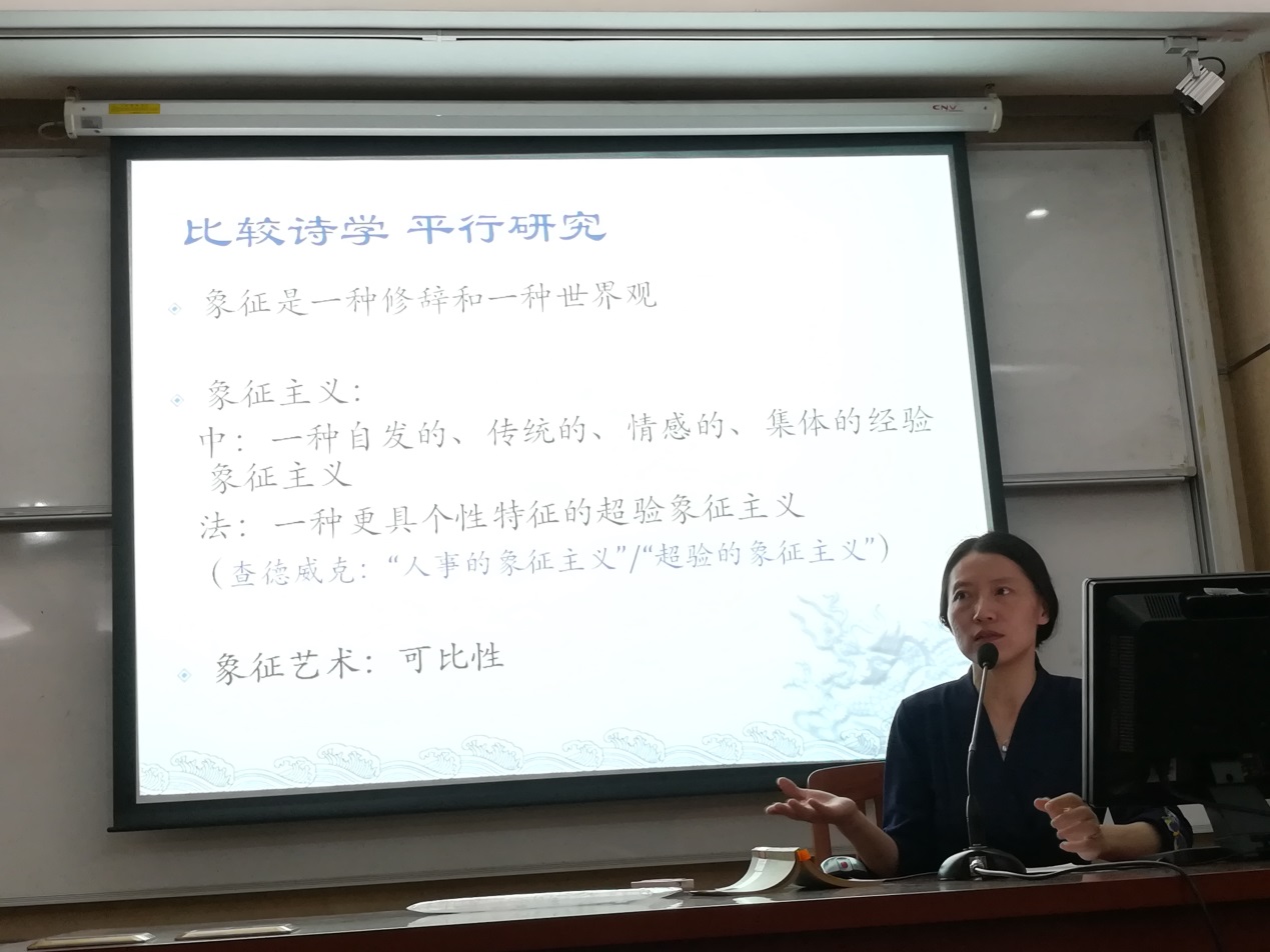 车琳教授以波德莱尔、魏尔伦、兰波、马拉美的几首诗歌为例,展示了其与雨果式浪漫主义诗歌、戈蒂埃式巴拿斯派诗歌的差异,与实证主义哲学和自然主义文学的决裂,凸显了象征主义诗人的追求。她特别引用了我校已故著名学者梁宗岱先生在其名篇《象征主义》(收入《诗与真·诗与真二集》)中,对“象征”的定义,在向梁先生致敬的同时,过渡到了对中国古代诗歌的象征修辞的介绍和讨论,认为“象征是一种修辞和一种世界观”。随后,她将这种个别性、片段性的讨论,转化为对比较文学的平行研究的认同和运用,升华为对中法诗学理论和实践的系统研究。最后,她从影响研究的角度,指出了魏尔伦、马拉美创里面中国元素的存在事实,以及中国现代诗人,诸如李金发、王独清、穆木天、冯乃超、戴望舒、卞之琳、梁宗岱,在法国象征主义诗歌影响下的创作,及其在中国现代诗歌发展中的历史意义。