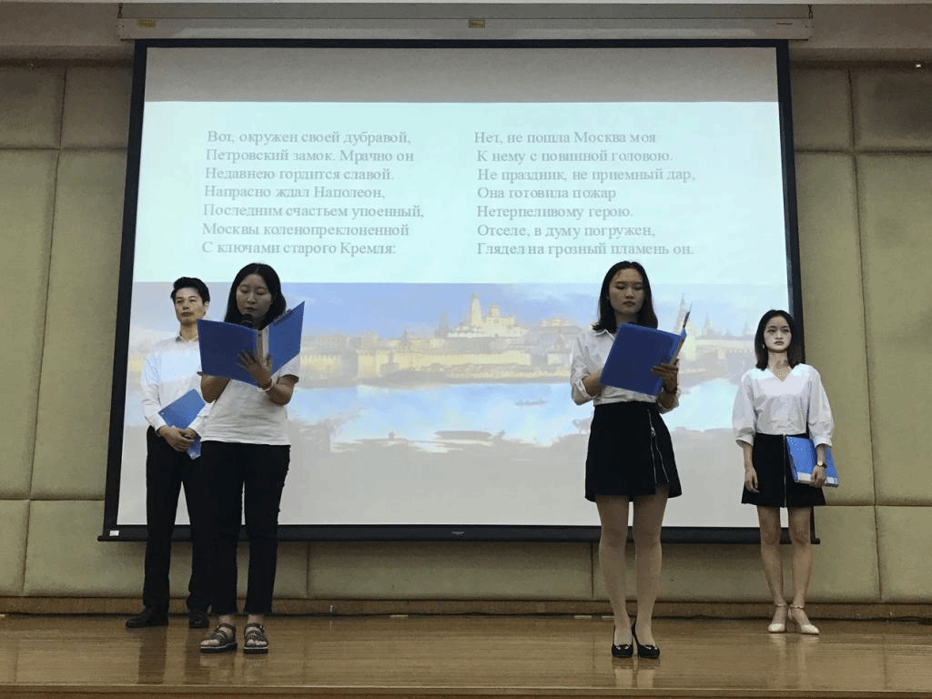 随后,便是最精彩的表演环节。来自各院校的学生们为本届“俄语日”带来了精彩绝伦的表演。学生们采用诗朗诵、电影配音、合唱舞蹈的形式纪念中俄建交70周年,将俄罗斯独特而富有魅力的文化展示给现场观众们。
