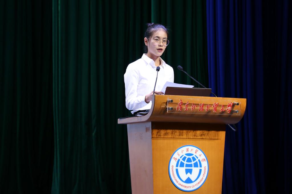 学生会主席邹绮琳以及新生代表、德语1901班陈如钰发言。她们在台上大方自信的模样,像我们展示了广外西语人应有的形象。