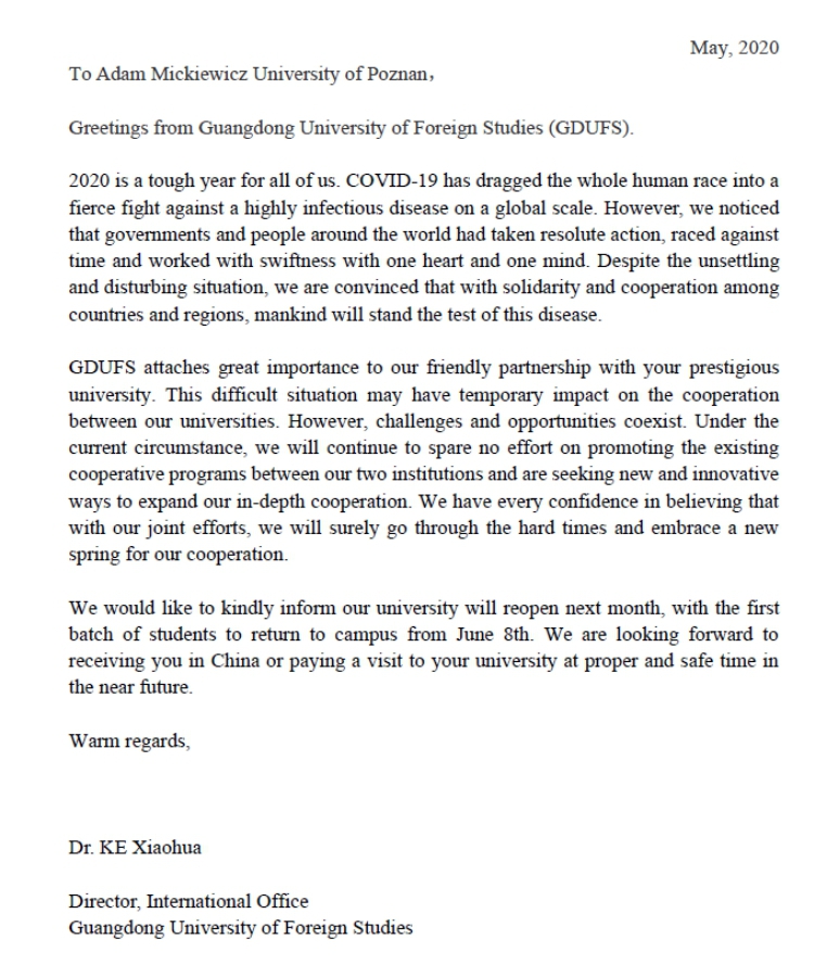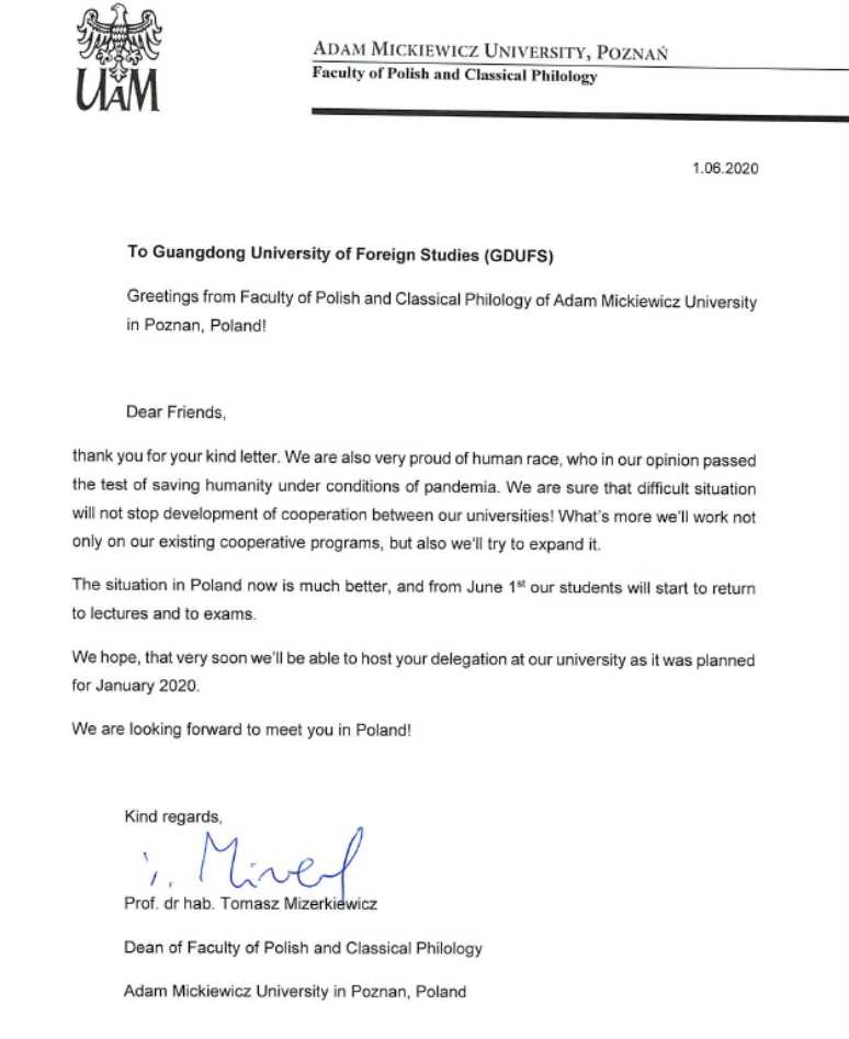 米泽尔凯维奇院长很快回函,称为双方团结抗疫、共度时艰而感到自豪。他相信,困难的形势不会阻挡高校间合作的发展,波兹南大学将会继续协同广外完成现有合作计划,并努力向新的方向延展合作模式。在信函结尾,他补充了波兰疫情现状及波兹南大学学生返校安排,同时也衷心期盼双方能早日会面。