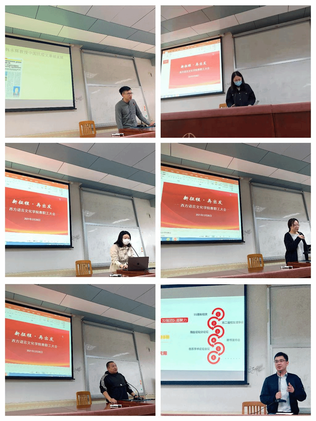 俄语系副教授费俊慧挂职国际交流处副处长,人事处师资科科长肖锐挂职我学院院长助理。随后,学院系(办)主任进行了年度工作述职,分别从师资队伍建设、人才培养、教学活动、教研科研成果、外事工作及活动、社会服务等方面梳理了过去一年取得的成绩,总结了经验,展望了新学期的工作。