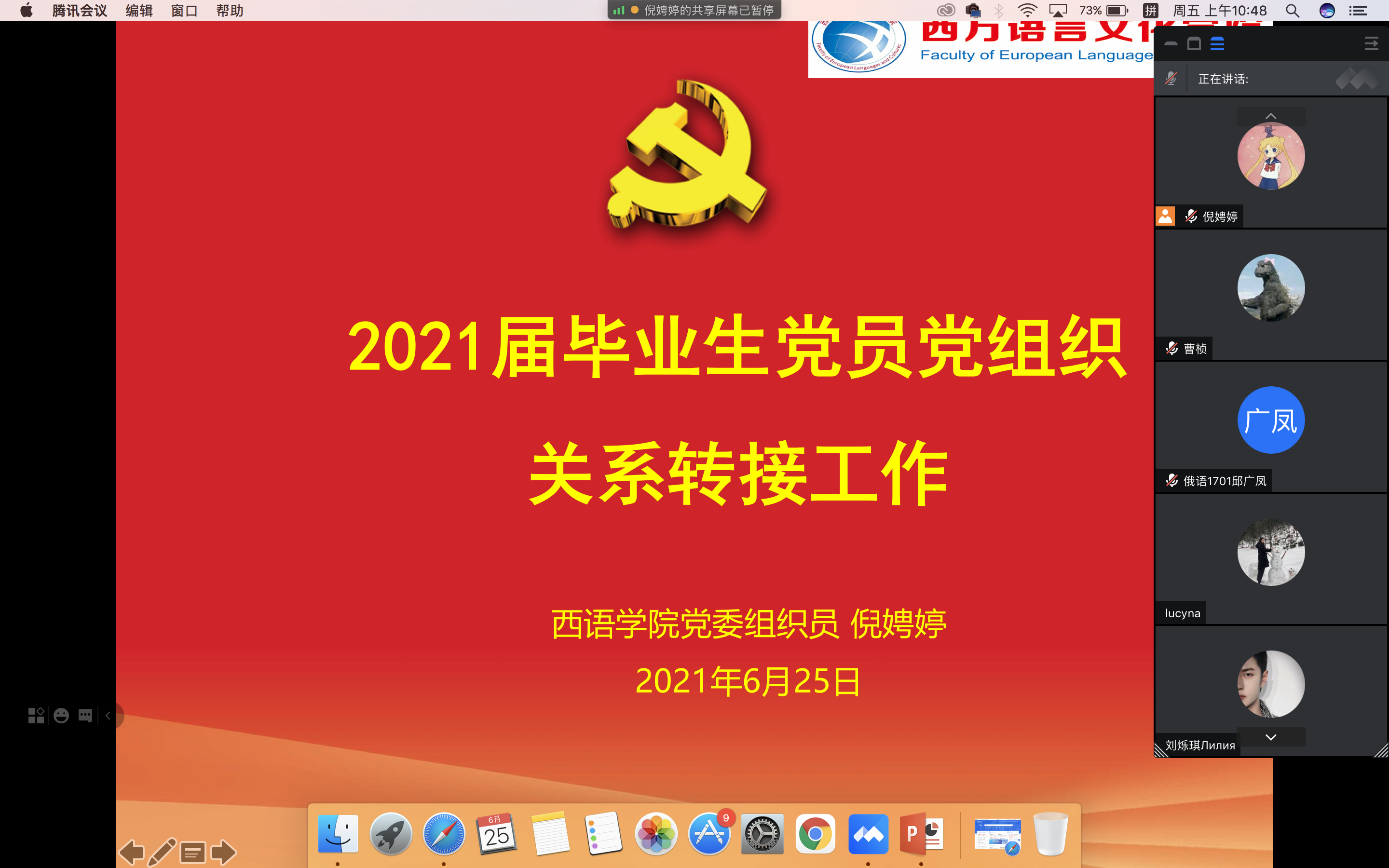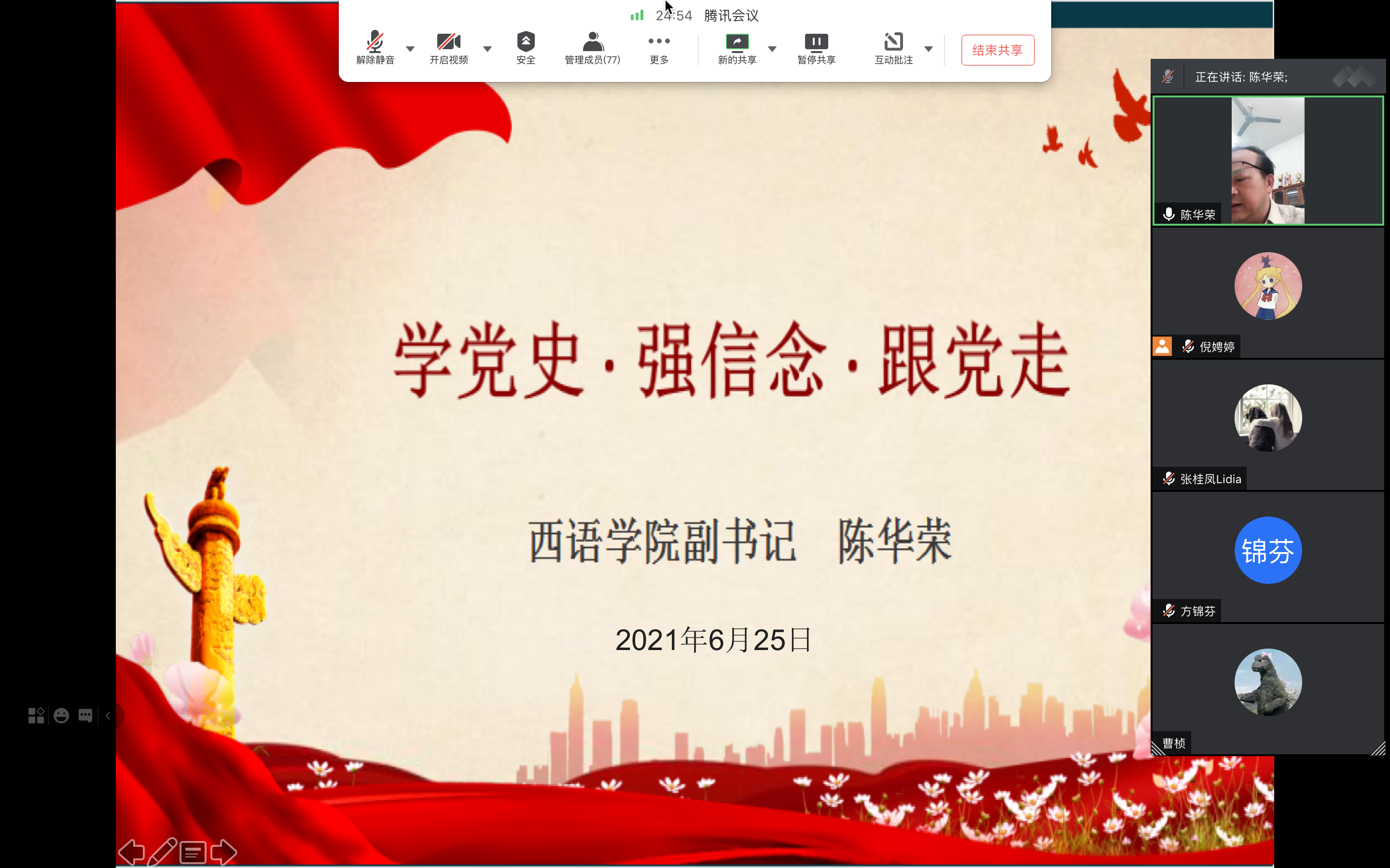 召开2021届毕业生党员思政“最后一课”,学院党委副书记陈华荣、组织员倪娉婷、全体毕业生党员共计77人参与本次活动。