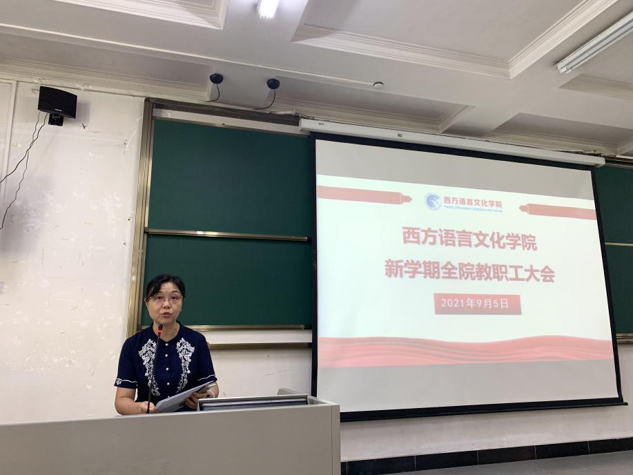 敖湘晖首先向全体教师介绍了本学期新加入捷克语系的高晓潼老师,俄语系黄时勋老师完成全部的教学工作,光荣退休。她指出,人才引进是学院的重要工作,上学期各系在人才引进方面做出了很大的努力,为学院的发展注入了新鲜血液,要继续做好传帮带和教师培养工作,更好的服务学校高水平大学建设。