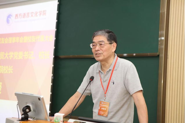 党委书记、校长、现浙江越秀外国语学院校长徐真华讲话。徐真华教授引用法国作家名句阐述校友会的工作意义,他将校友会比作“生生不息的生命之河”,希望更多代表新生力量的新校友加入校友会,努力张扬广外精神、西语风格;希望校友们走向社会后,不忘初心使命,寻找人生意义、创造生命价值;希望优秀校友更好的帮助一代代毕业生,搭建好桥梁纽带,将广外西语的优良传统传扬到世界各地。