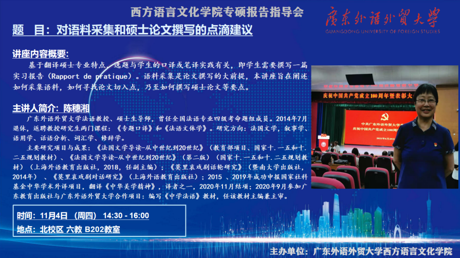 法语系陈穗湘教授主讲,题为《对语料采集和硕士论文撰写的点滴建议》。讲座由法语系陈湘蓉老师主持,欧美a片