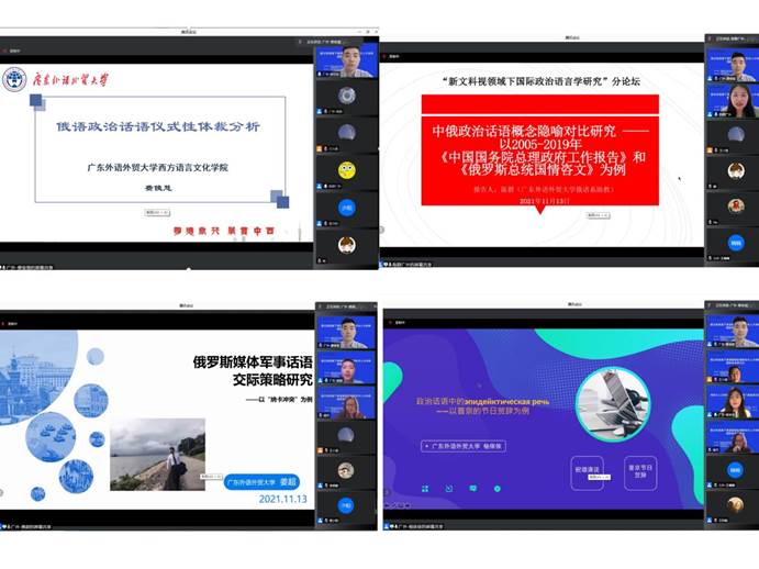俄语系费俊慧副教授主持了下午的“新文科视域下国际政治语言学研究”分论坛并以《俄语政治话语仪式性体裁分析》为题进行了发言。分论坛上俄语系教师陈群的发言《中俄政治话语概念隐喻对比研究——以2005-2019年〈中国国务院总理政府工作报告〉和〈俄罗斯总统国情咨文〉为例》,博士生杨依依的发言《政治话语中的эпидейктическая речь——以普京的节日贺辞为例》和博士生姜超的发言《俄罗斯媒体军事话语交际策略研究》分别展示了欧美a片