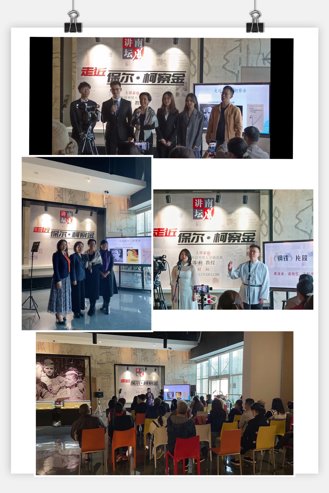 参与本次沙龙活动的几位同学也分享了自己的感受。潘晨同学表示:“《钢铁是怎样炼成的》这部小说自己很小的时候就读过,没想到有朝一日可以在公开活动上朗诵俄语版的经典名言。”潘星宇同学表示:“在场的观众中,无论是朝气蓬勃的青年人,还是须发皆白的老先生,都沉浸其中,令人感动。希望以后自己能阅读更多书籍,增加对俄罗斯的历史和现实的了解。”参与了广图和佛图两次活动的吴浩添同学表示:“感谢广外老师给予如此宝贵的机会,让我们能够在精彩纷呈的活动中展现俄语朗诵的魅力,歌颂俄国革命先驱坚强无畏的战斗精神。”(撰写:潘晨)