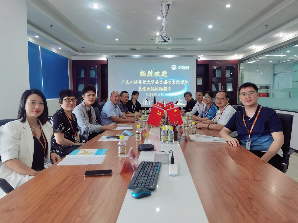 6月17日上午,敖湘晖一行来到校友企业–深圳市巨航国际物流有限公司,受到杰出校友胡新添、马锦鹏、黄英、肖婷的热烈欢迎。学院方和企业方各自介绍了近年的发展历程和人员职责,对广外毕业生就业观念的变迁进行了分析,搭起了持续沟通合作的桥梁。