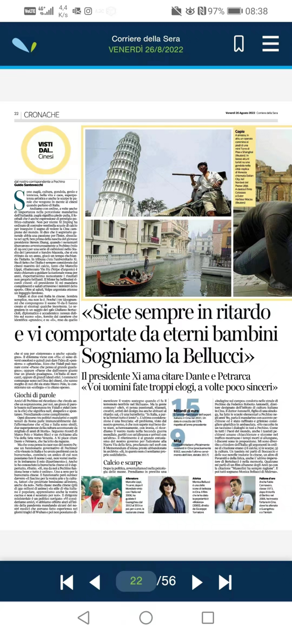 2022年8月26日,欧美a片 意大利语系张海虹教授接受意大利《晚邮报》采访。该报是意大利第一纸媒,也是其国内历史最悠久的报纸。采访中,张老师分享了她研究成果《形象、消费与身份认同:中国“90后”女性对意大利奢侈品消费》中我国九零后女性心目中的意大利人形象。