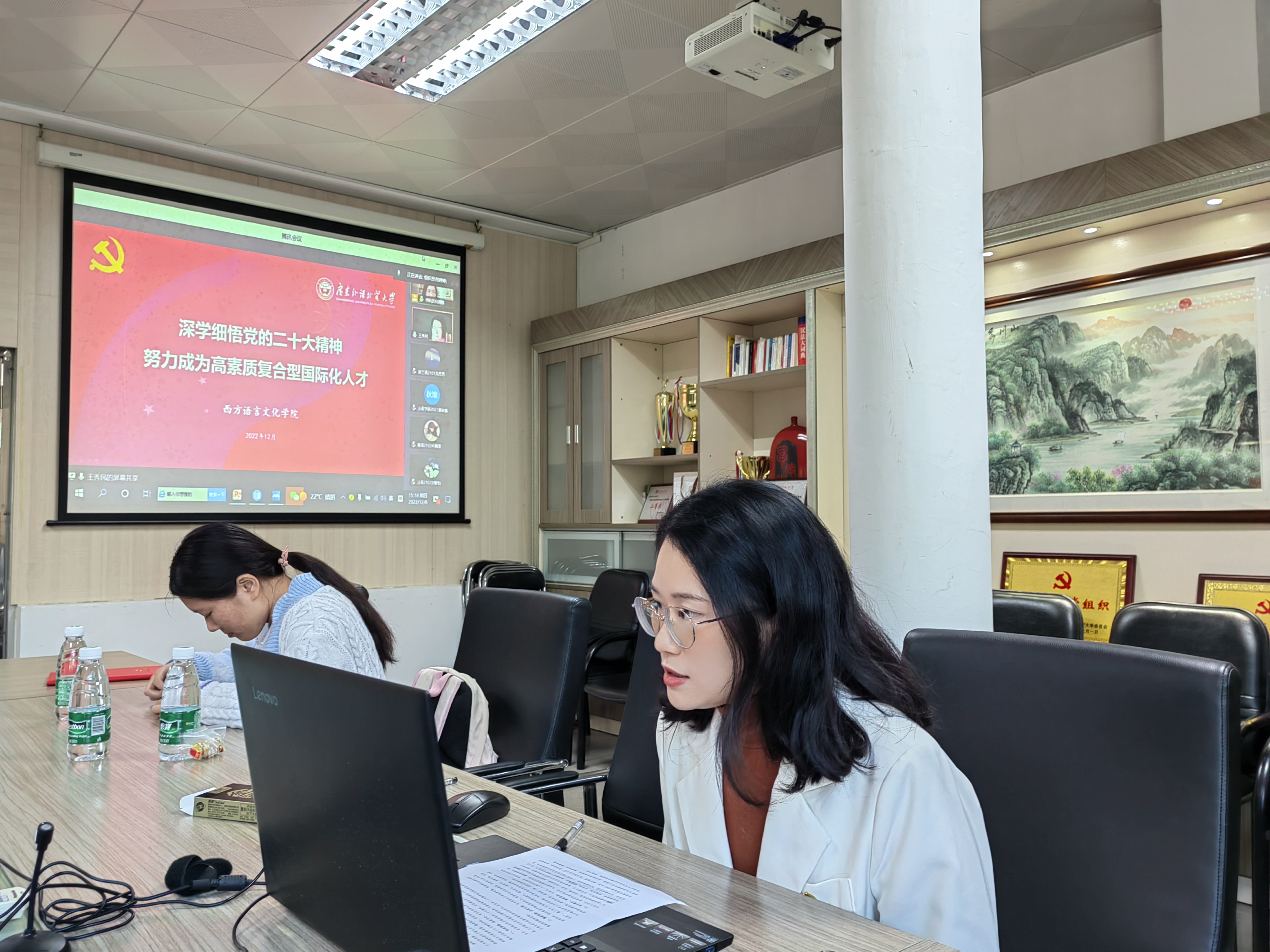组织开展党的二十大精神专题党课学习,学院党委书记王秀民主讲“深学细悟党的二十大精神,努力成为高素质复合型国际化人才”的专题党课。学生入党积极分子共计155人通过线上和线下形式参与本次学习,组织员倪娉婷主持活动。