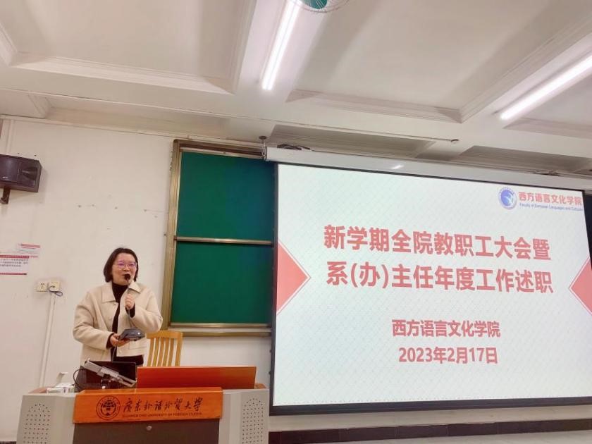 会上,学院各系(办)主任依次进行年度工作述职,分别从党建思政、师资队伍建设、教研科研成果、人才培养、教学活动、外事工作、社会服务、办公室服务、凝聚力建设等方面梳理了过去一年取得的成绩,总结了经验,展望了新学期的工作。