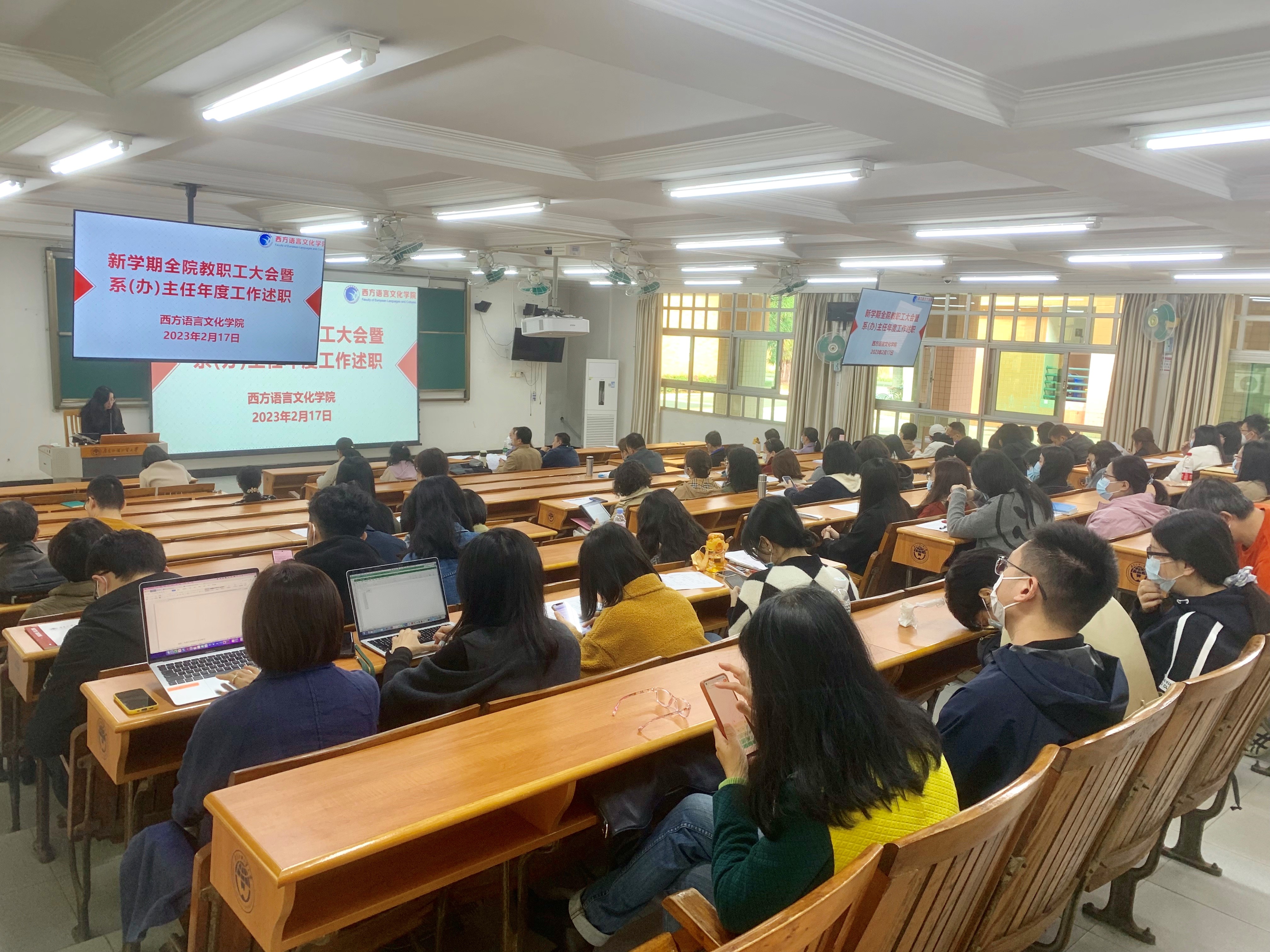 在二教116教室召开了新学期全院教职工大会暨系(办)主任年度工作述职大会,学院领导班子、全院教职工共计80余人出席会议。会议由学院党委书记王秀民主持。