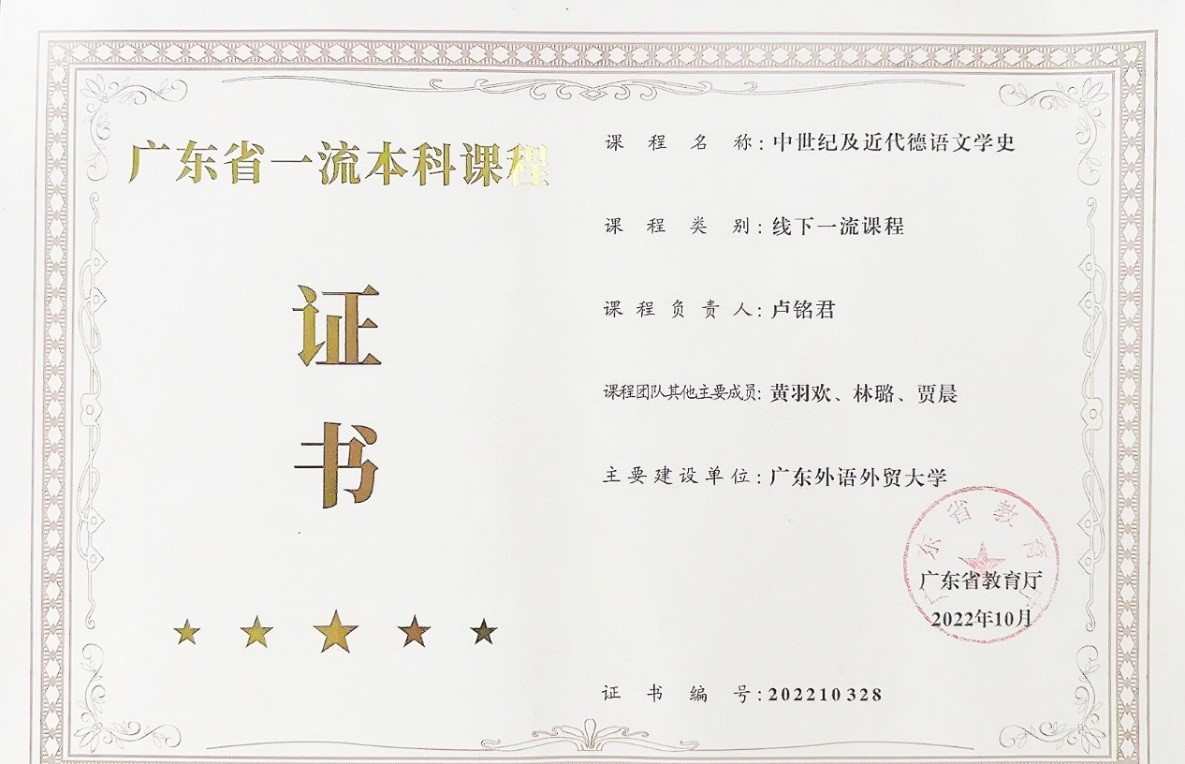 《中世纪及近代德语文学史》获广东省线下一流本科课程证书