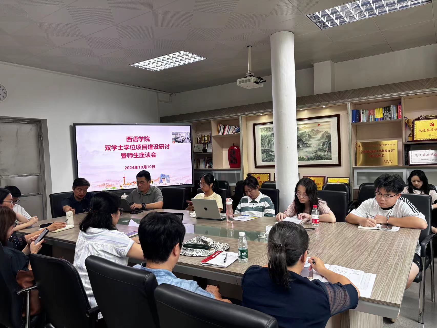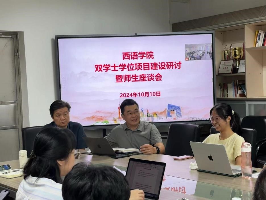 副院长陈星、党委副书记魏少娟、经济贸易学院国际贸易系系主任田云华,法语系主任叶剑如、德语系主任助理张思源、西班牙语系主任吴凡、俄语系主任陈欢、意大利语系主任张海虹、葡萄牙语系主任助理杨菁,教务办公室老师以及数名西语2024级双学士学位班级学生代表。本次会议以双学士学位项目的建设研讨,就学生提出的关于学习方面的问题、建议以及未来规划上的疑惑展开讨论,各领导老师给出了一些建议并对同学们作出了殷切希望。