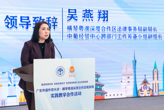吴燕翔在发言中指出,中葡经贸中心的核心使命是搭建连接中国与葡语国家的一站式综合服务平台。在实践中发现,企业对既精通语言又熟悉经贸实务的复合型人才需求迫切。她表示,“广外在人才培养方面具有丰厚的底蕴和基础,合作区税务局在加强中国与葡语国家税务合作方面做出了重要贡献。”未来,中心愿积极研究建立人才培养、实践实训与就业输送的合作机制,联合企业设立专项实训或岗位,共同为青年人才提供更广阔的职业舞台。