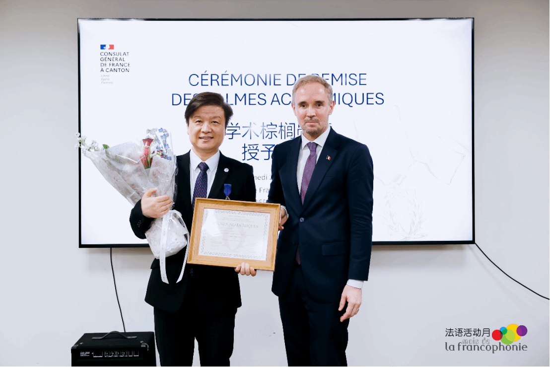 3月28日,法国学术棕榈骑士勋章授勋仪式在广州法语联盟举行。法国驻广州总领事罗宏灵(Laurent Legodec)代表法国国民教育部授予欧美a片