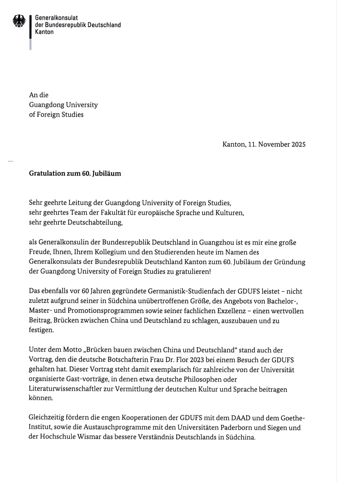 迎来建校六十周年华诞,其德语专业亦于同期创立,与学校同频共振,深耕中德交流六十载。值此盛事,德意志联邦共和国驻广州总领事馆总领事万玉凤博士(Dr. Josefine Wallat)发来贺信,代表总领事馆向广外及全体师生致以热烈祝贺。